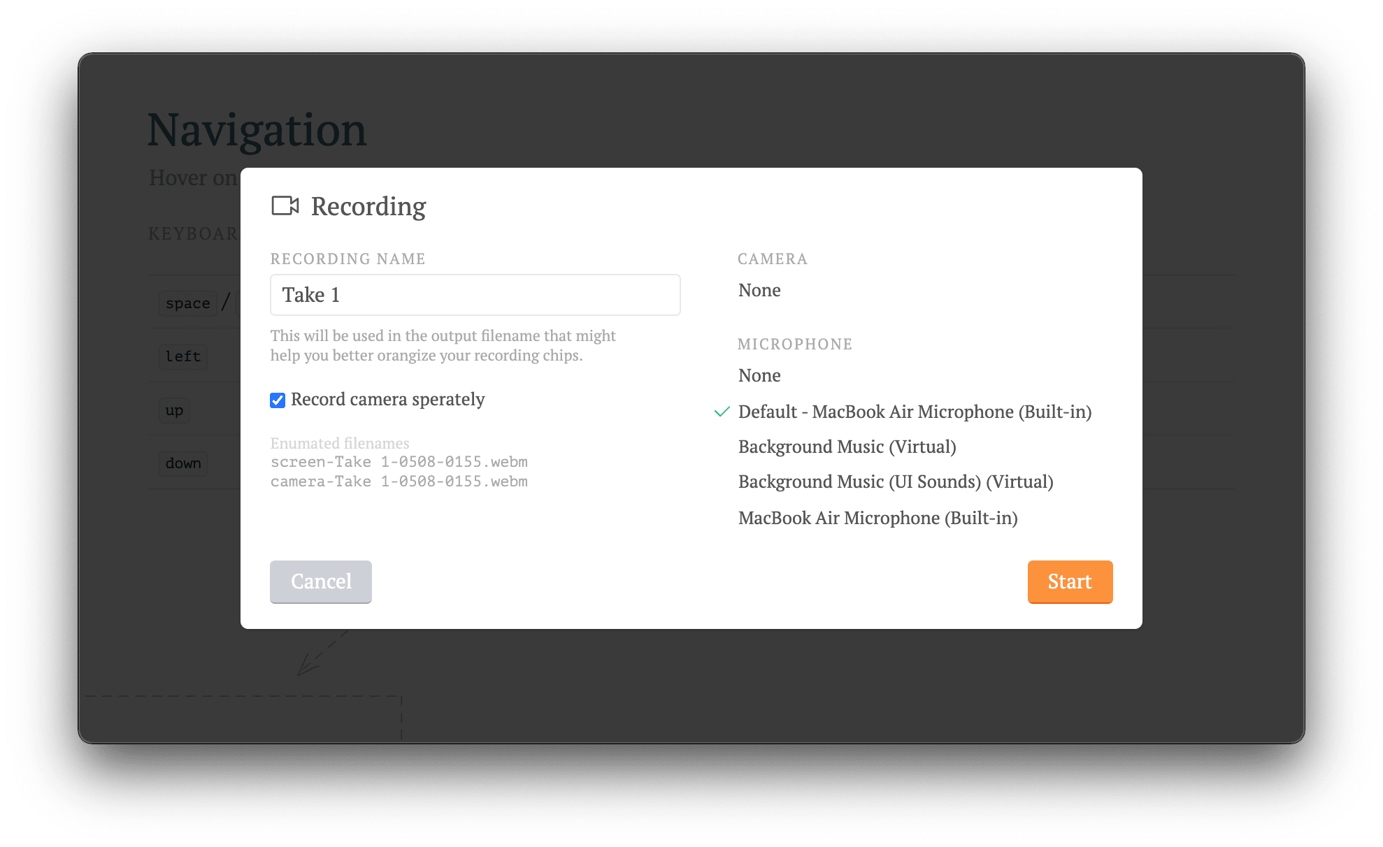 Clicking the button in the navigation bar will bring up a dialog for you. Here you can choose to either record your camera output embedded in your slides or to separate them into two video files.